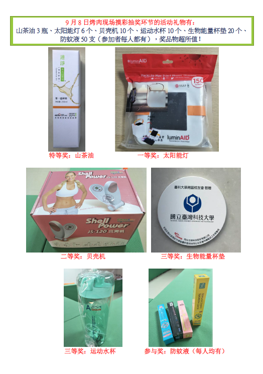 烤肉現場摸彩抽獎活动禮物:山茶油3瓶、太陽能燈6個、貝殼機10個、運動水杯10個、生物能量杯墊20個、防蚊液50支(参加者每人都有),獎品物超所值