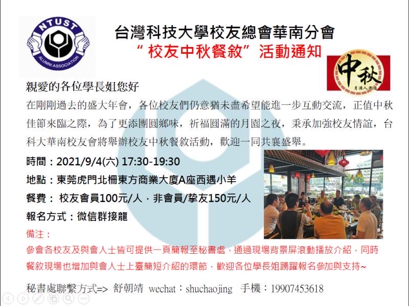 【華南區校友會訊息】09/04(六)校友中秋餐敘活動