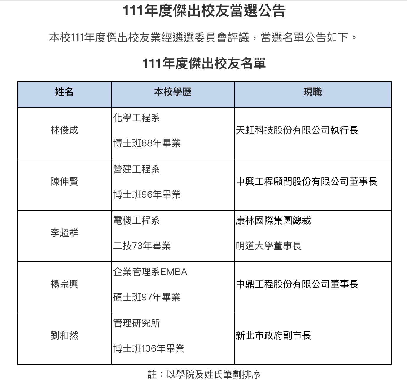 【母校訊息】111年度傑出校友當選公告